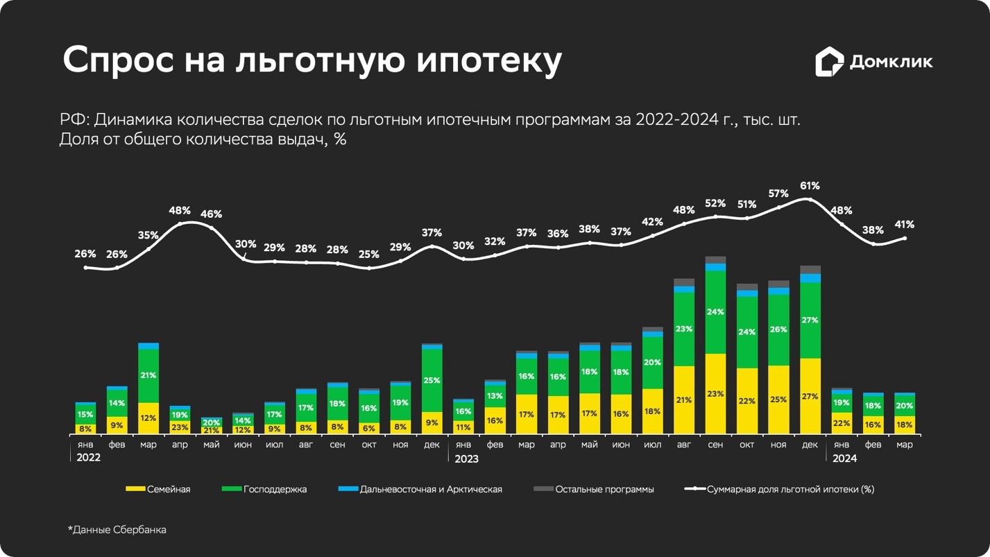 Динамика количества выдач по льготным программам по РФ за 2022–2024 гг. (данные Сбера). Динамика доли выдач по всем льготным программам относительно общего количества выдач показана белой линией (в %). Выдачи по программе «Семейная ипотека» обозначены жёлтым, по программе «Господдержка» — зеленым, по «Дальневосточной» и «Арктической ипотеке» — голубым. Остальные программы (IT-ипотека, «Сельская ипотека», льготная ипотека в Республике Тыва) обозначены серым.