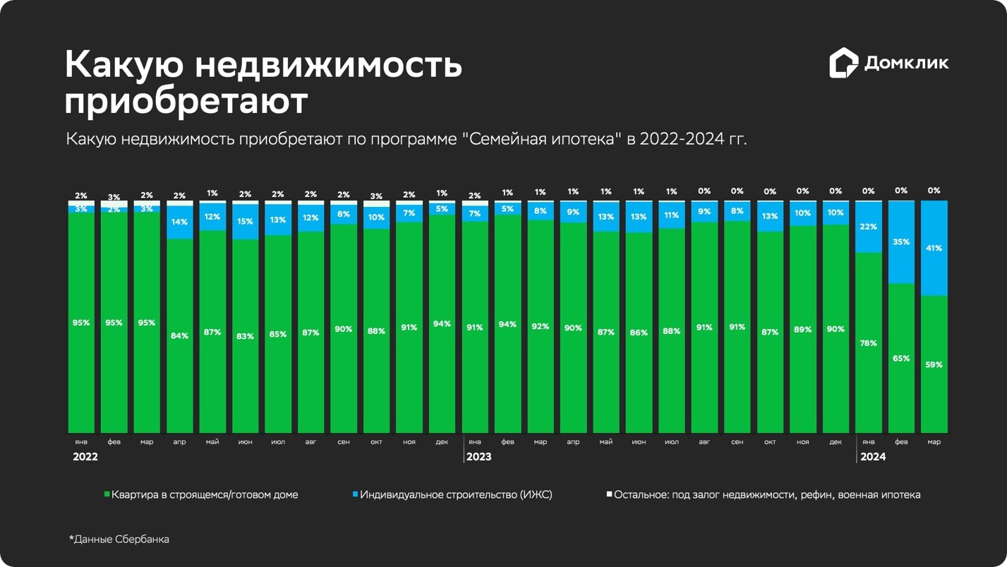 Распределение количества выдач по программе «Семейная ипотека» по приобретённым типам недвижимости (данные Сбера). Доля сделок в общем количестве выдач по приобретению квартиры в строящемся/готовом доме обозначена как «Квартира в строящемся/готовом доме». Сюда же входят сделки по покупке недвижимости на вторичном рынке у физлица (в Ненецком и Чукотском автономных округах), инвестора или ИП, а также в сельских населённых пунктах Дальневосточного федерального округа. Приведены данные по индивидуальному жилищному строительству (ИЖС). «Остальное» включает в себя нецелевые кредиты под залог недвижимости, рефинансирование, военную ипотеку.