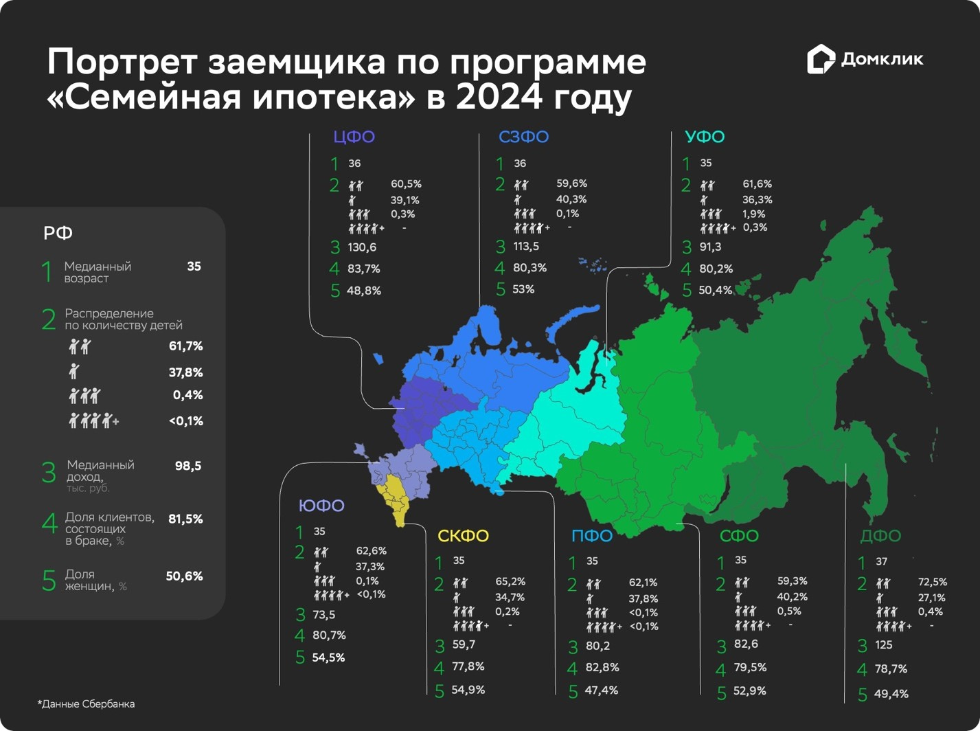 Портрет заёмщика по программе «Семейная ипотека» в 2024 году. Данные Сбера за первый квартал 2024 года.